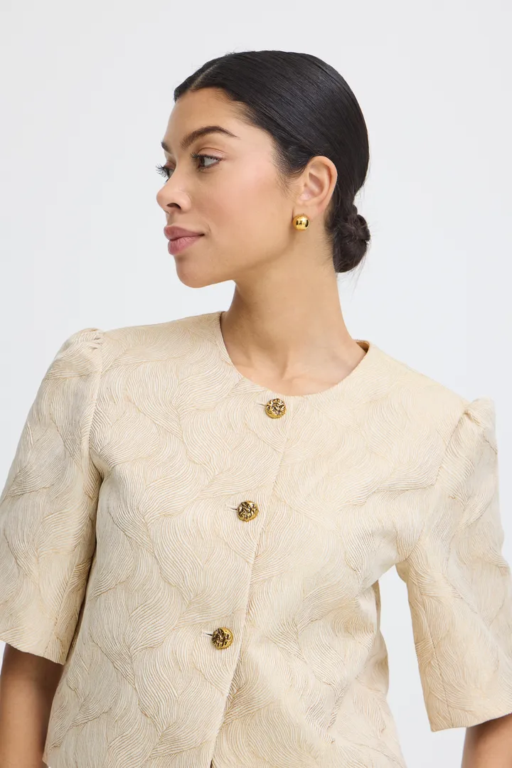 This cropped jacket style features a round neckline, three decorative front buttons, and elbow-length sleeves with a softly structured finish. The silhouette is boxy with lightly gathered shoulders for a gentle volume. The textured surface adds visual interest throughout.