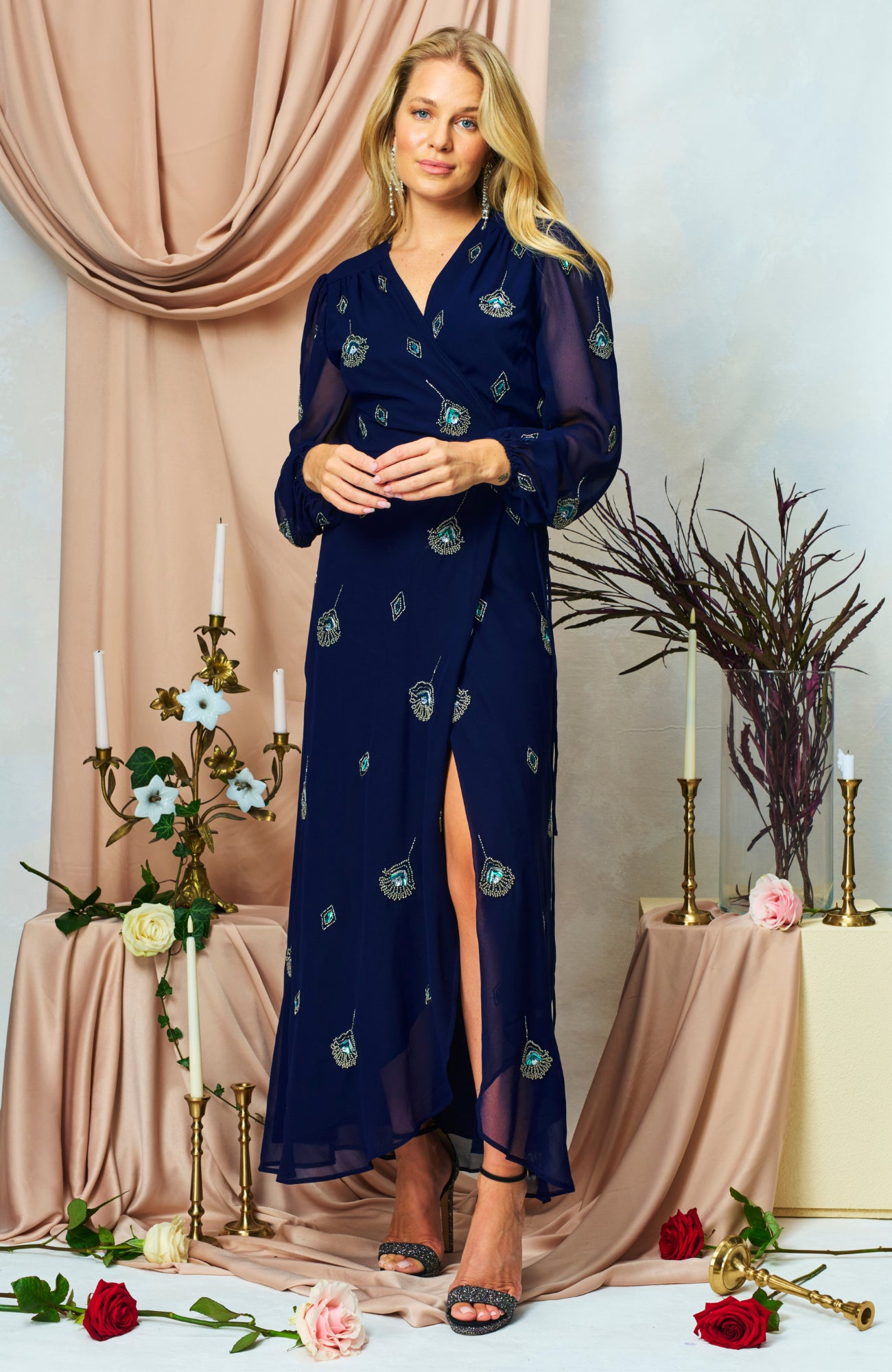 The Harper Embellished Blouson Sleeve Maxi Wrap Dress with Tie Waist