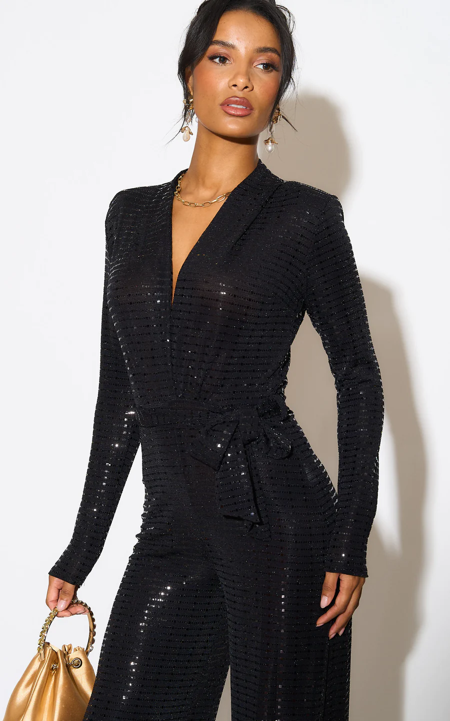 Let this stretchy black sparkle jumpsuit take you through the party period. With long sleeves, V-neck with wrapped look and a wide leg, this one is a winner. It has a tie belt to highlight the waist which you can tie at the front or back.