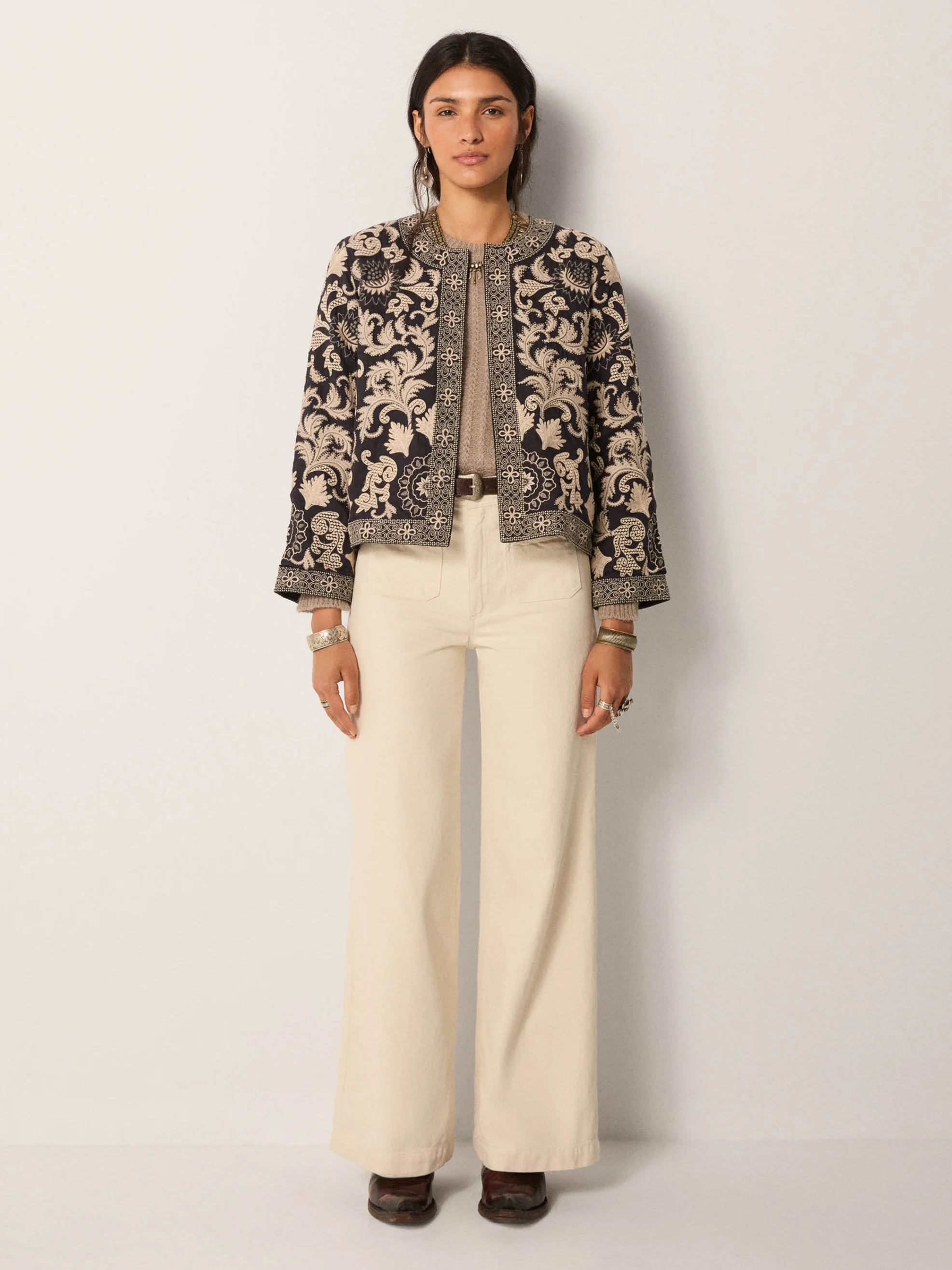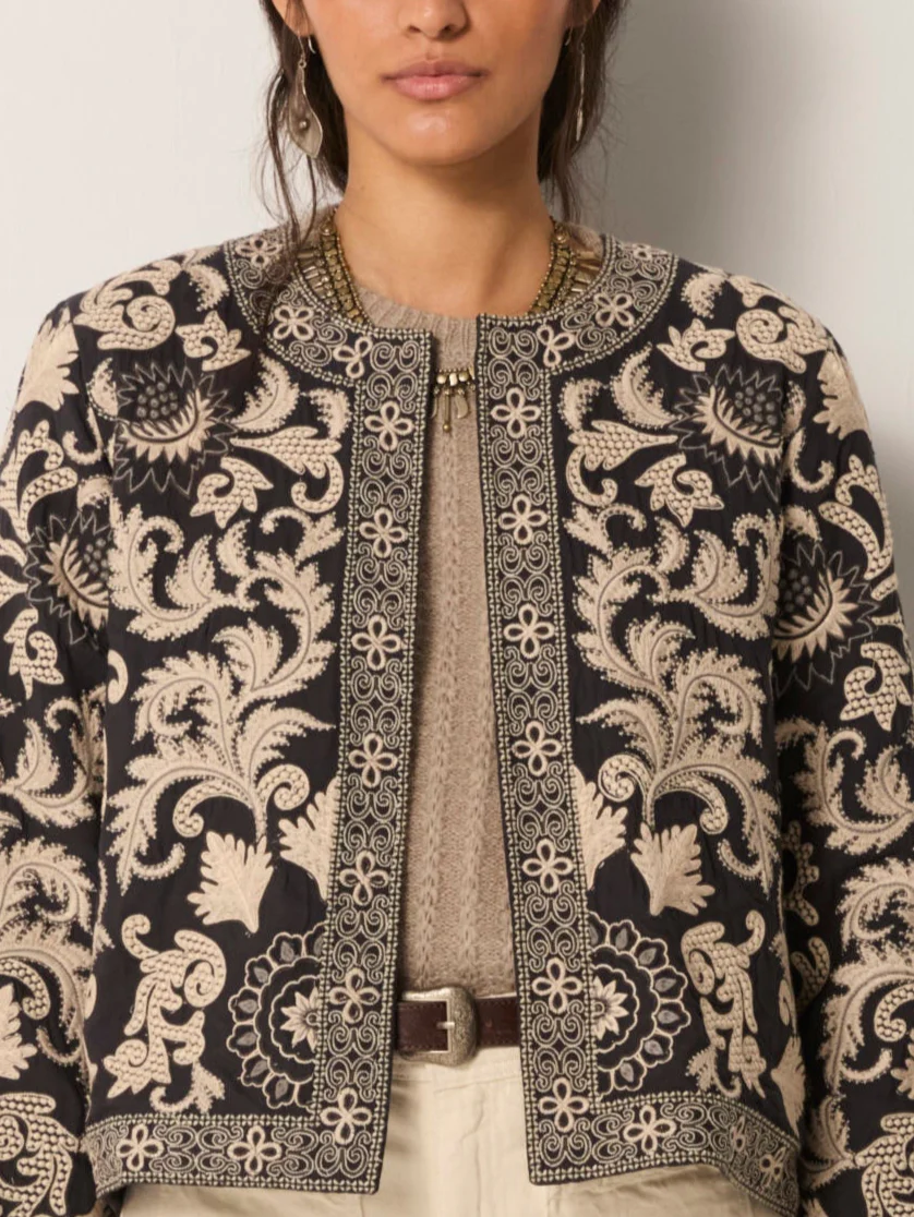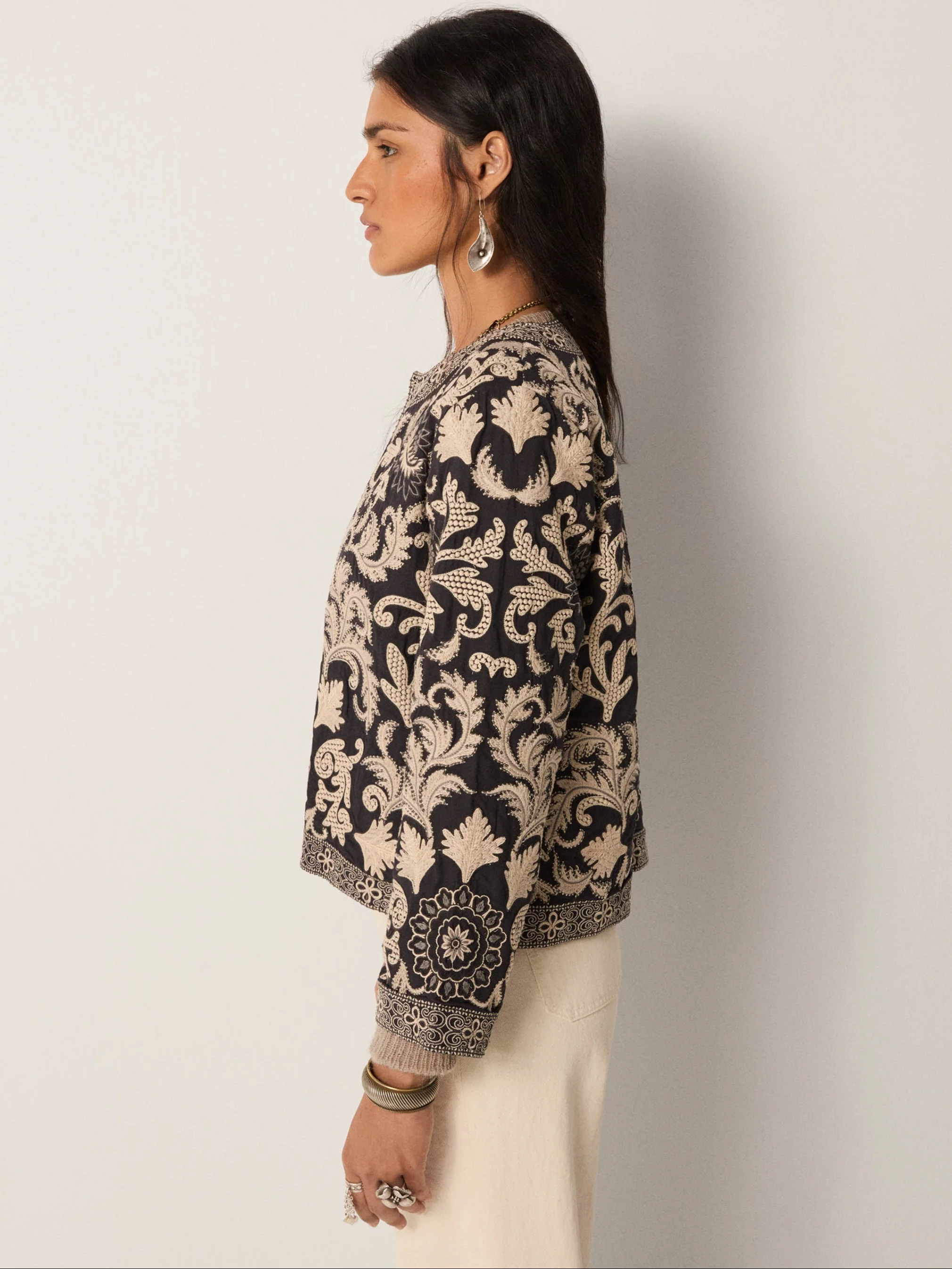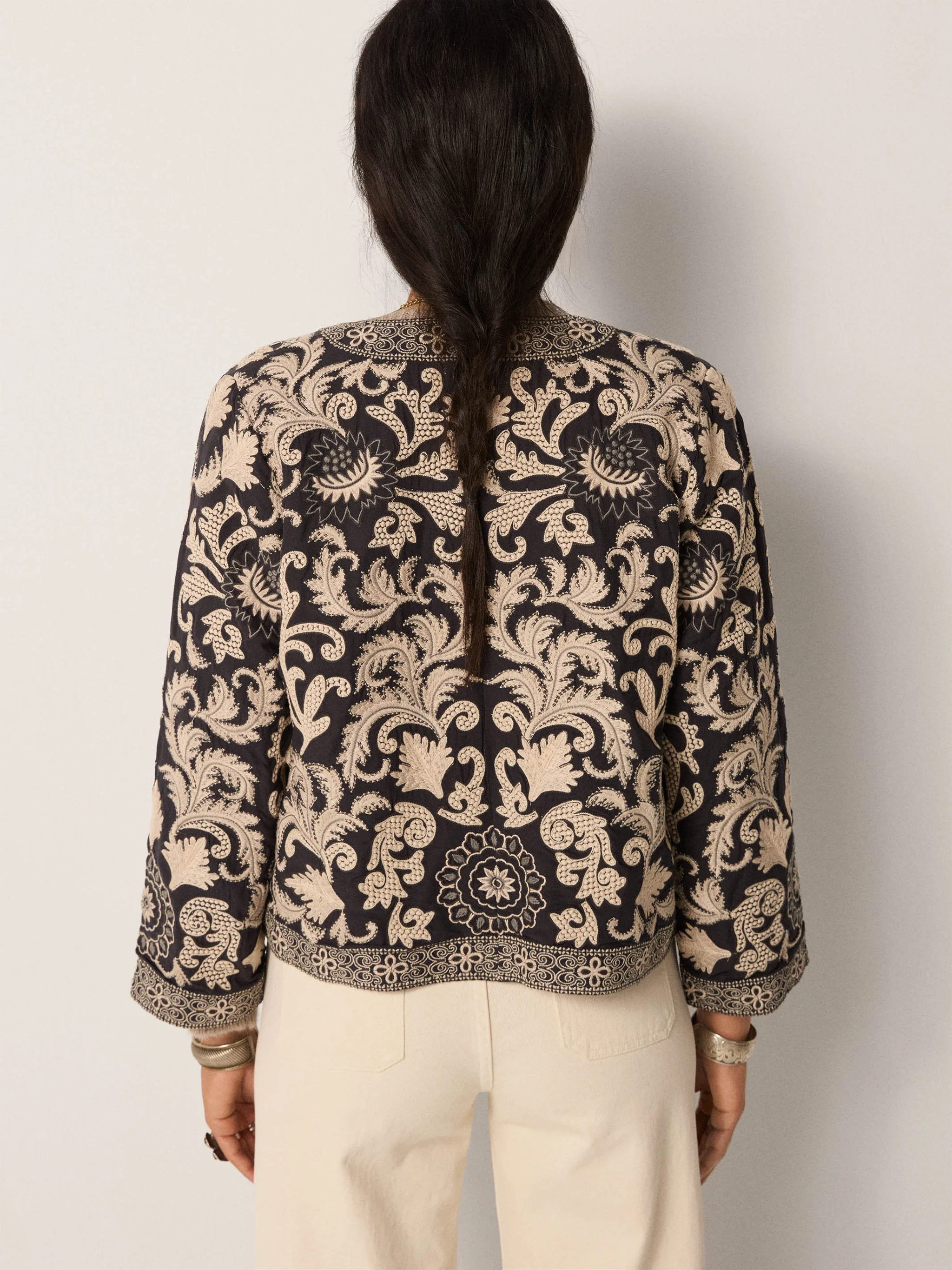 The embroidery covers the surface completely, with borders running along the placket and hem to frame the florals. Light padding adds quiet structure, making it a statement piece without harshness.