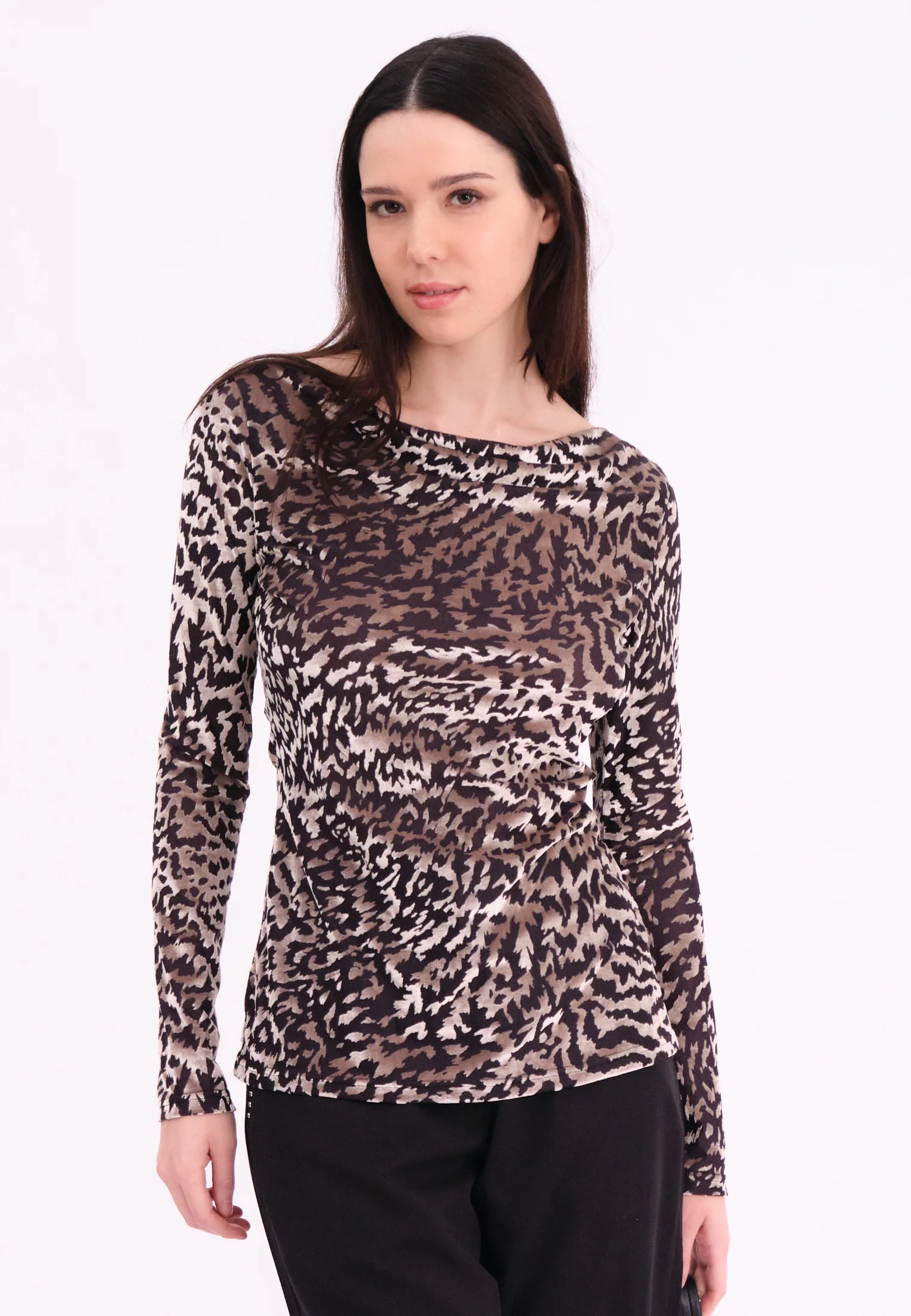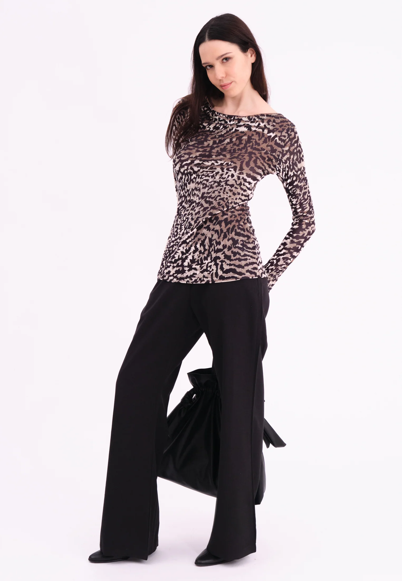 The Emmy Top is a striking piece in burn-out velvet with a silver and black animal jacquard pattern. Featuring a boat neck, long sleeves, and a fitted silhouette, it includes a tie belt at the waist for a flattering shape. With a hip-length cut, this versatile top seamlessly transitions from day to evening, making it an elegant addition to any wardrobe.