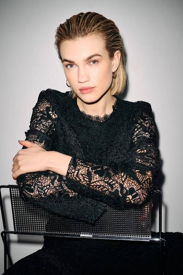 This cropped lace top features an intricate floral pattern and long sleeves, creating a delicate yet bold look. The scalloped hem and high neck add an elegant touch, making it perfect for both casual and dressy occasions.