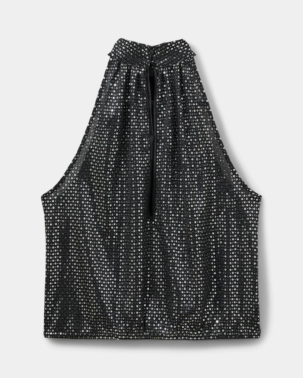 • The top is designed with fine silver sequin details that add a glamorous and eye-catching touch to the simple black color.