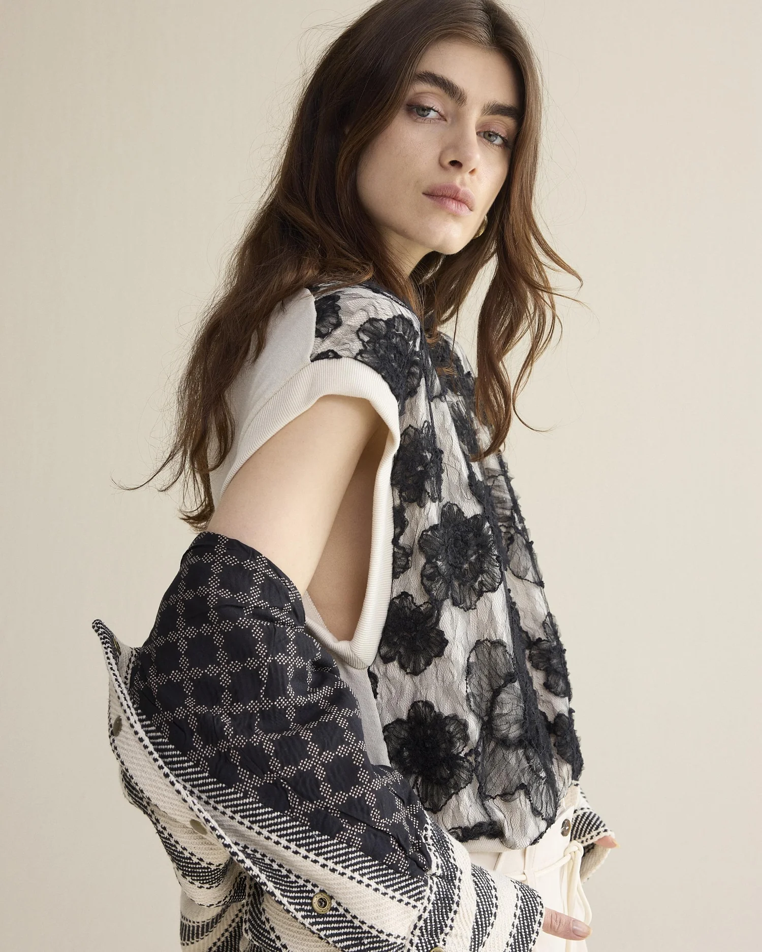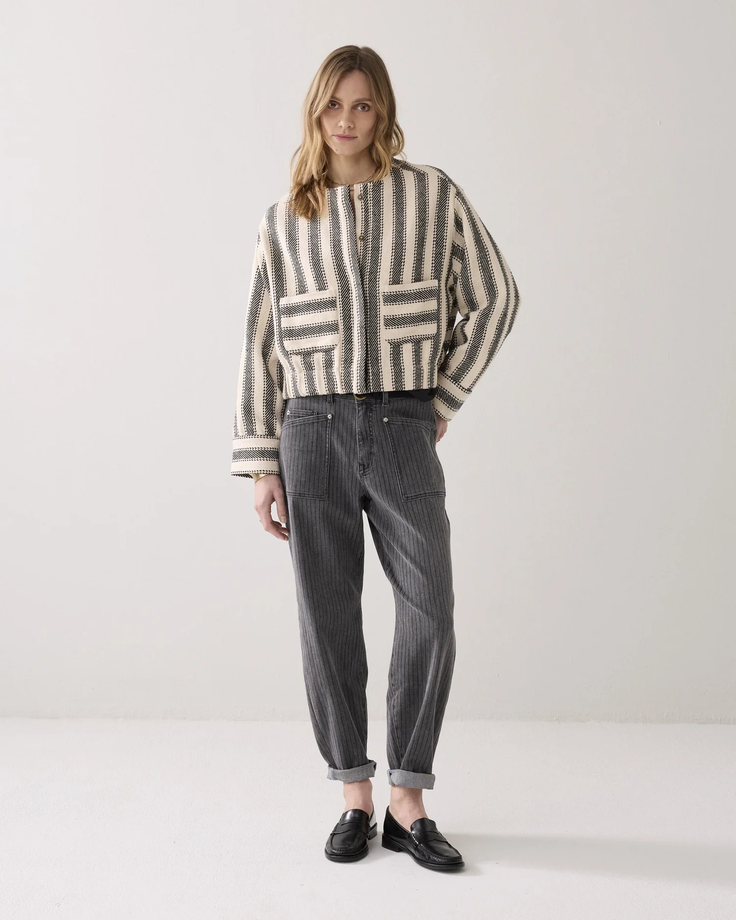 Reversible cropped jacket in a striped cotton with a contrasting lining on the inside. The jacket has an elasticated waist, wide straight sleeves and patch pockets. Finished with press-studs and wide cuffs.