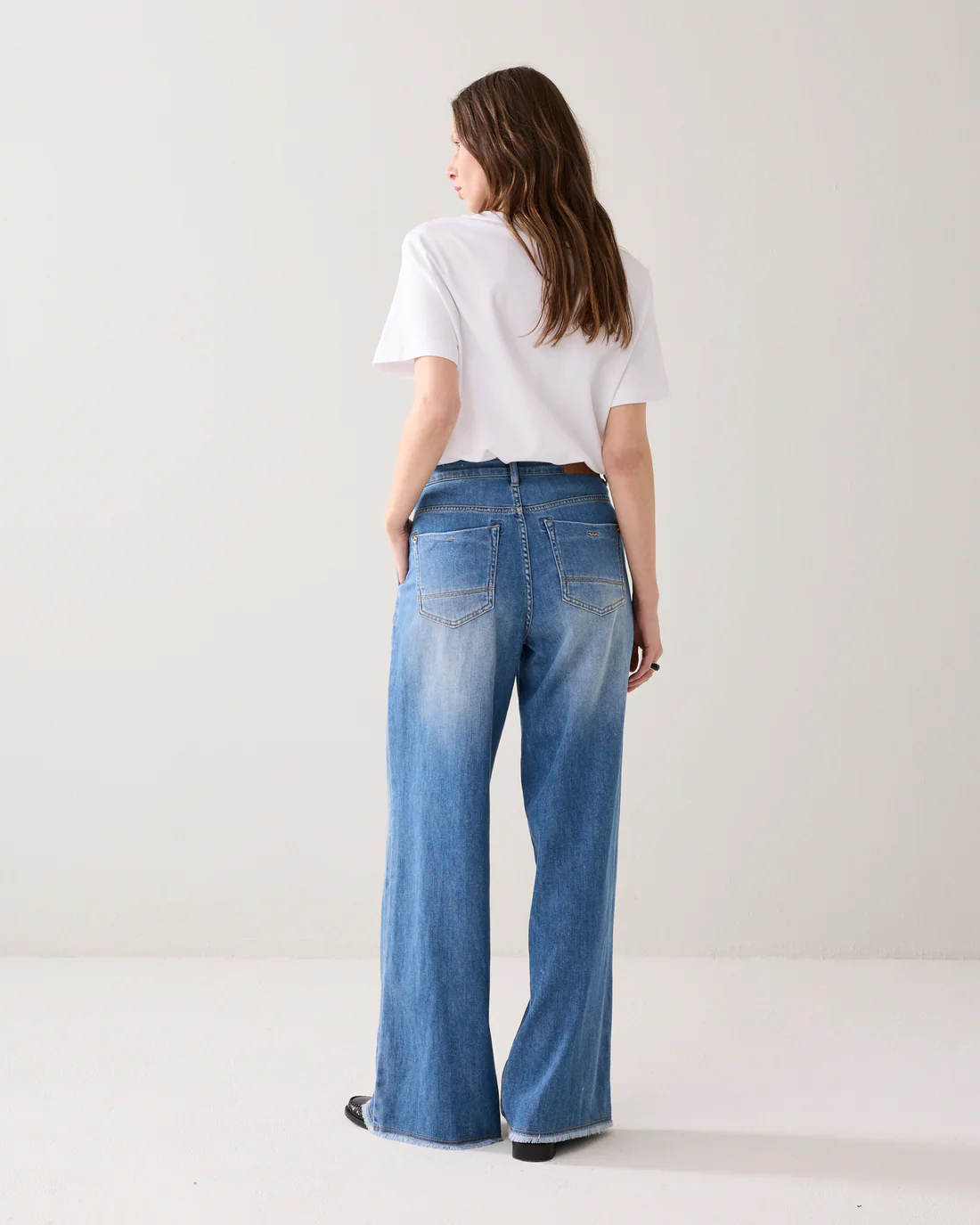 Palazzo trousers in a supple non-stretch denim in a light wash. The jeans have raw-edge details on the waistband and on the bottom of the legs.