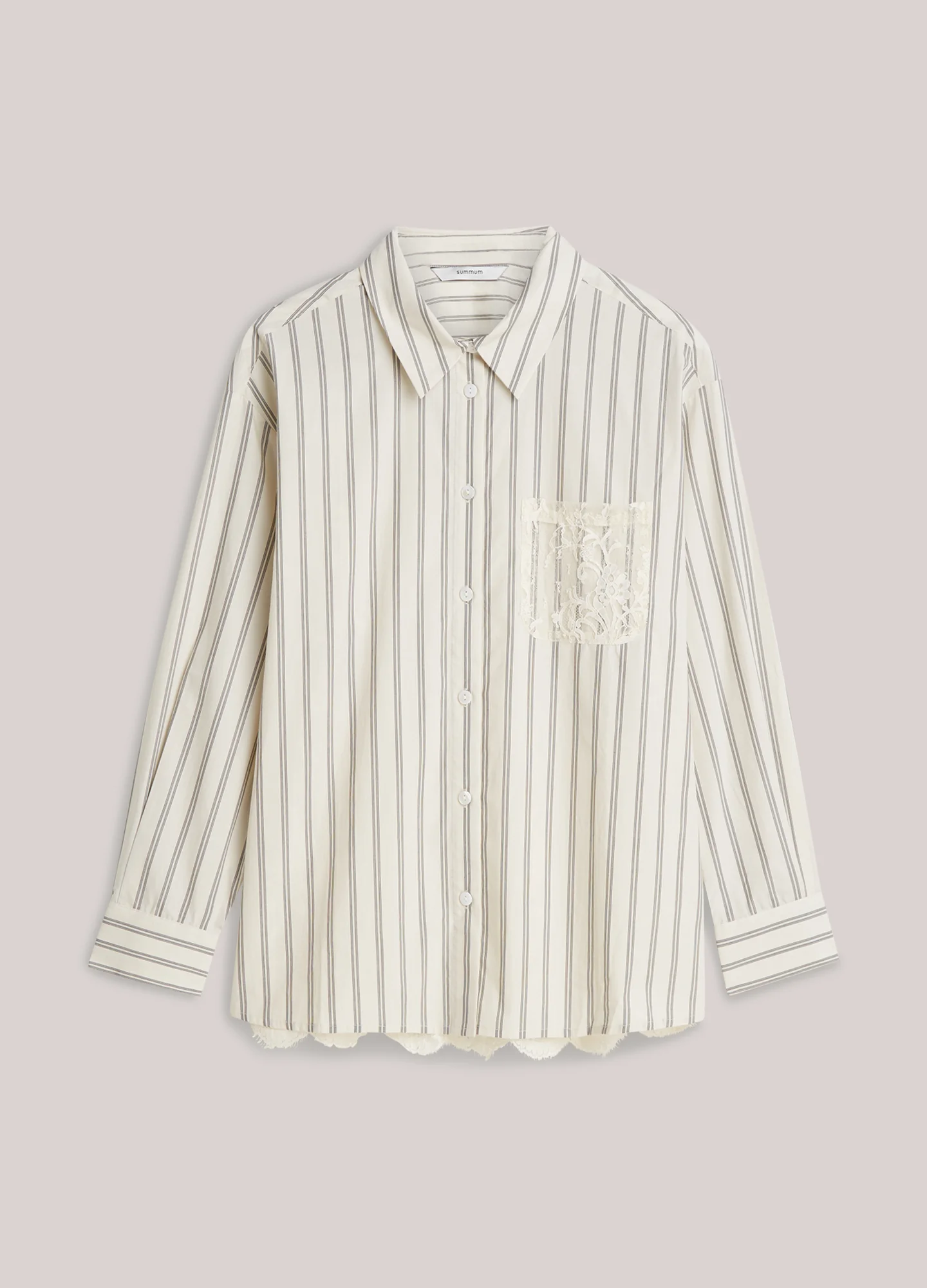 Loose-fitting shirt blouse in striped cotton with a transparent lace back. The chest pocket is also lace.