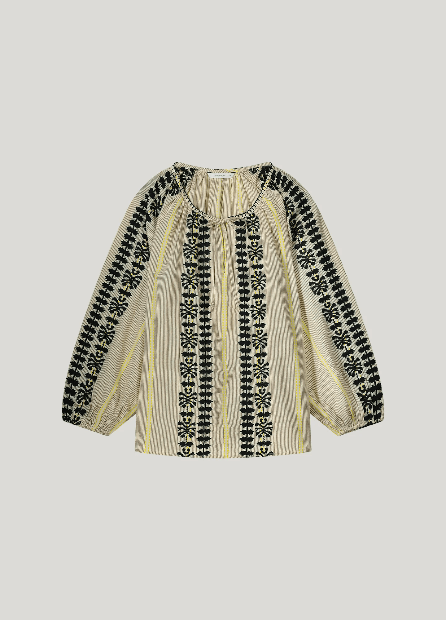 Airy bohemian top with stripe pattern and floral embroidery. Made of cotton with viscose for a nice fit. The round neckline is finished with a veston stitch and a slit with drawstring fastening..