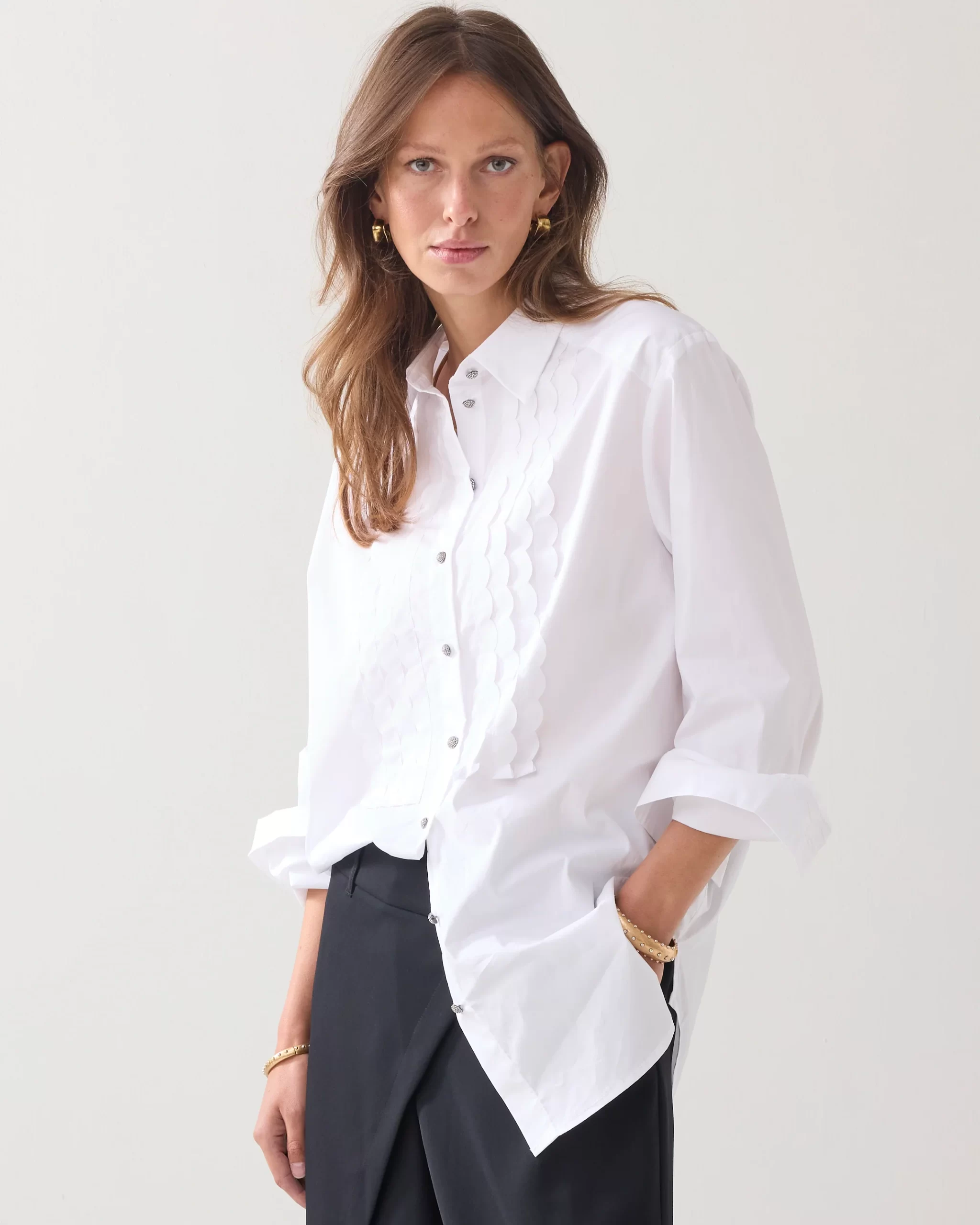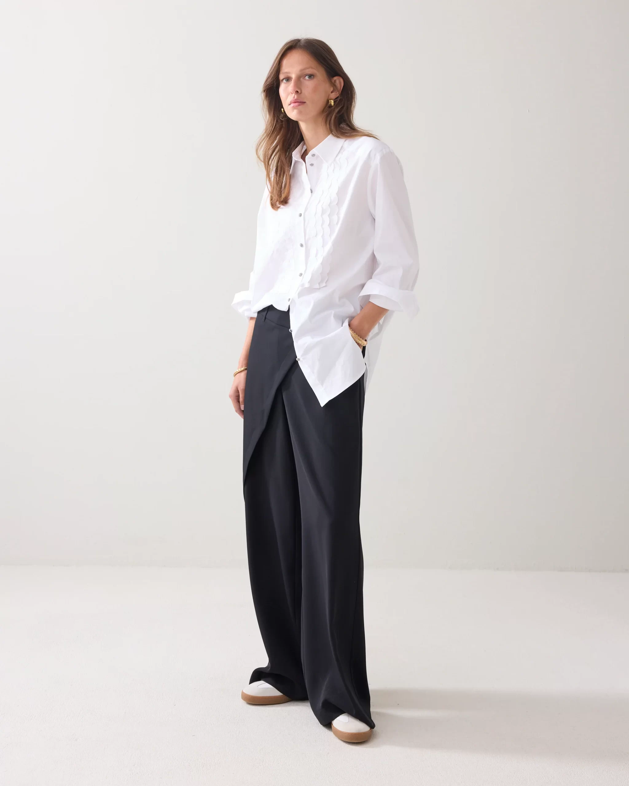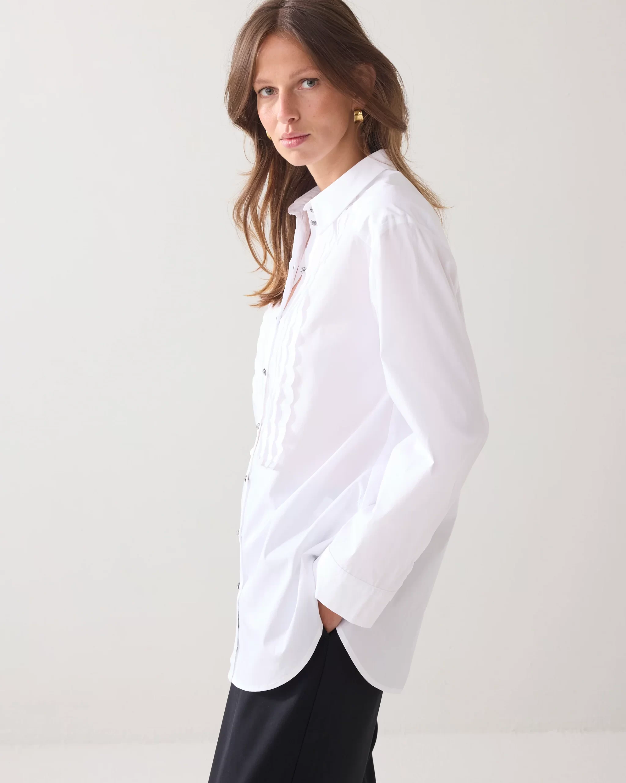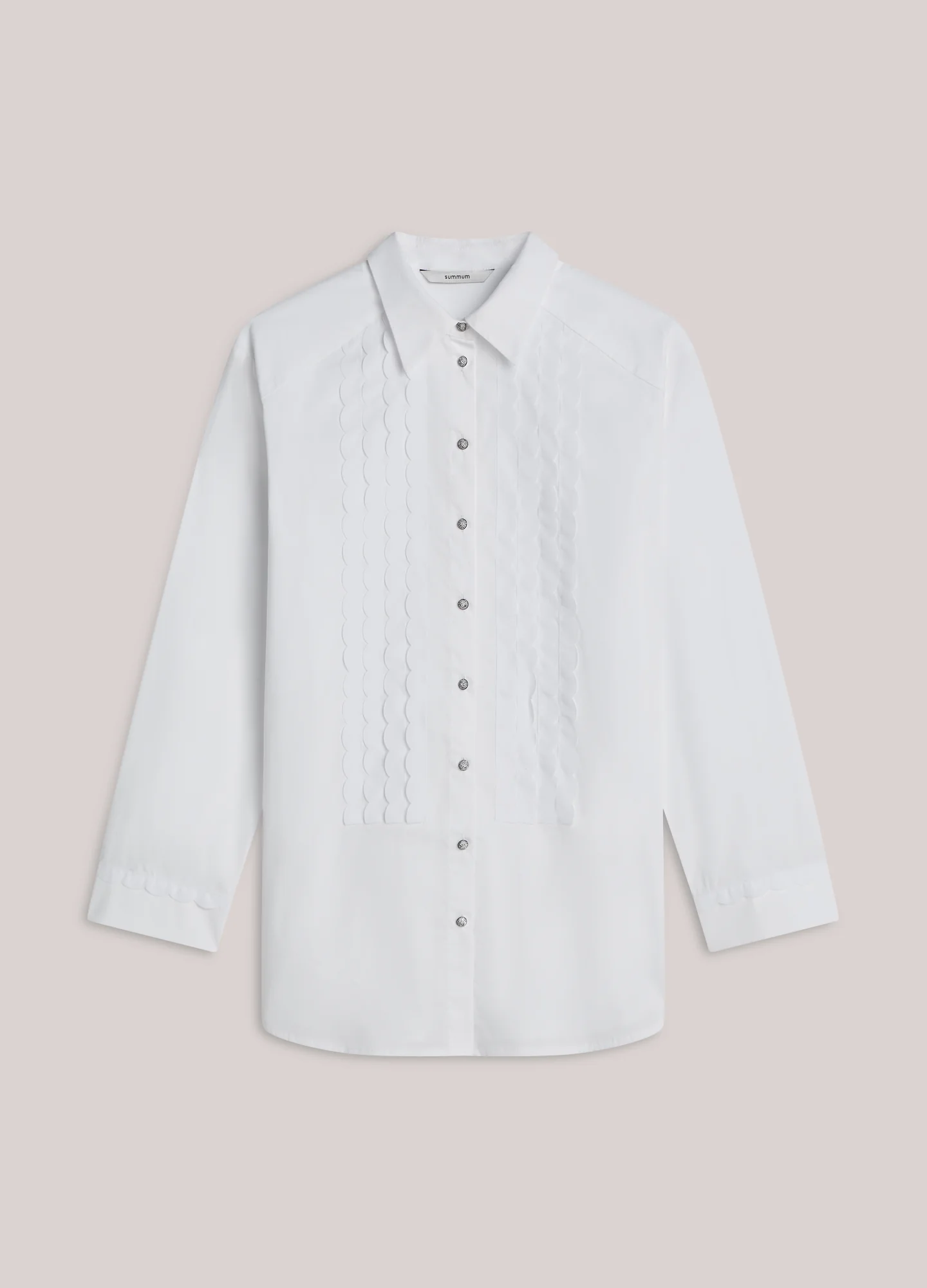 Shirt blouse in sturdy poplin with smoking jacket details. Finished with laser-cut strips and diamond buttons. Laser cuts and a button have also been added on the cuffs.