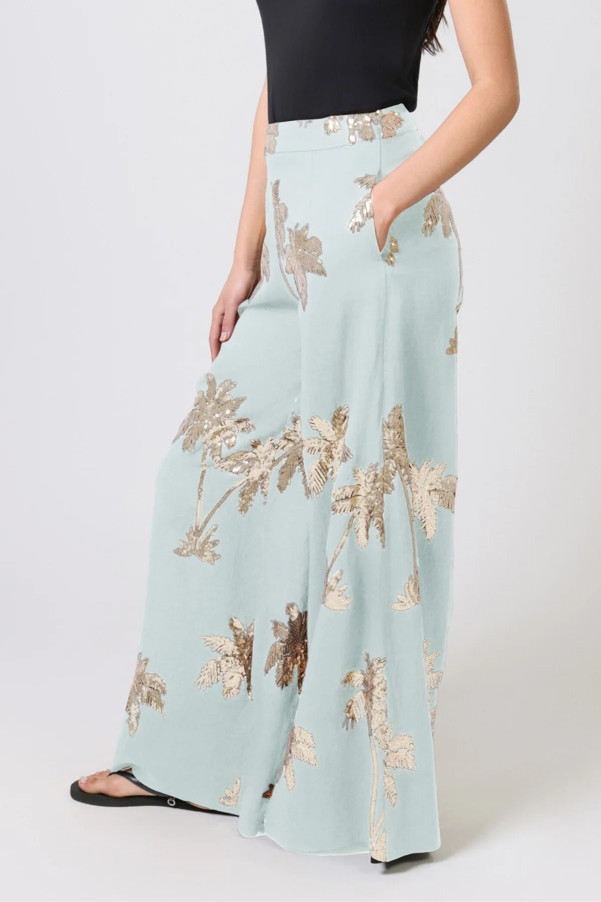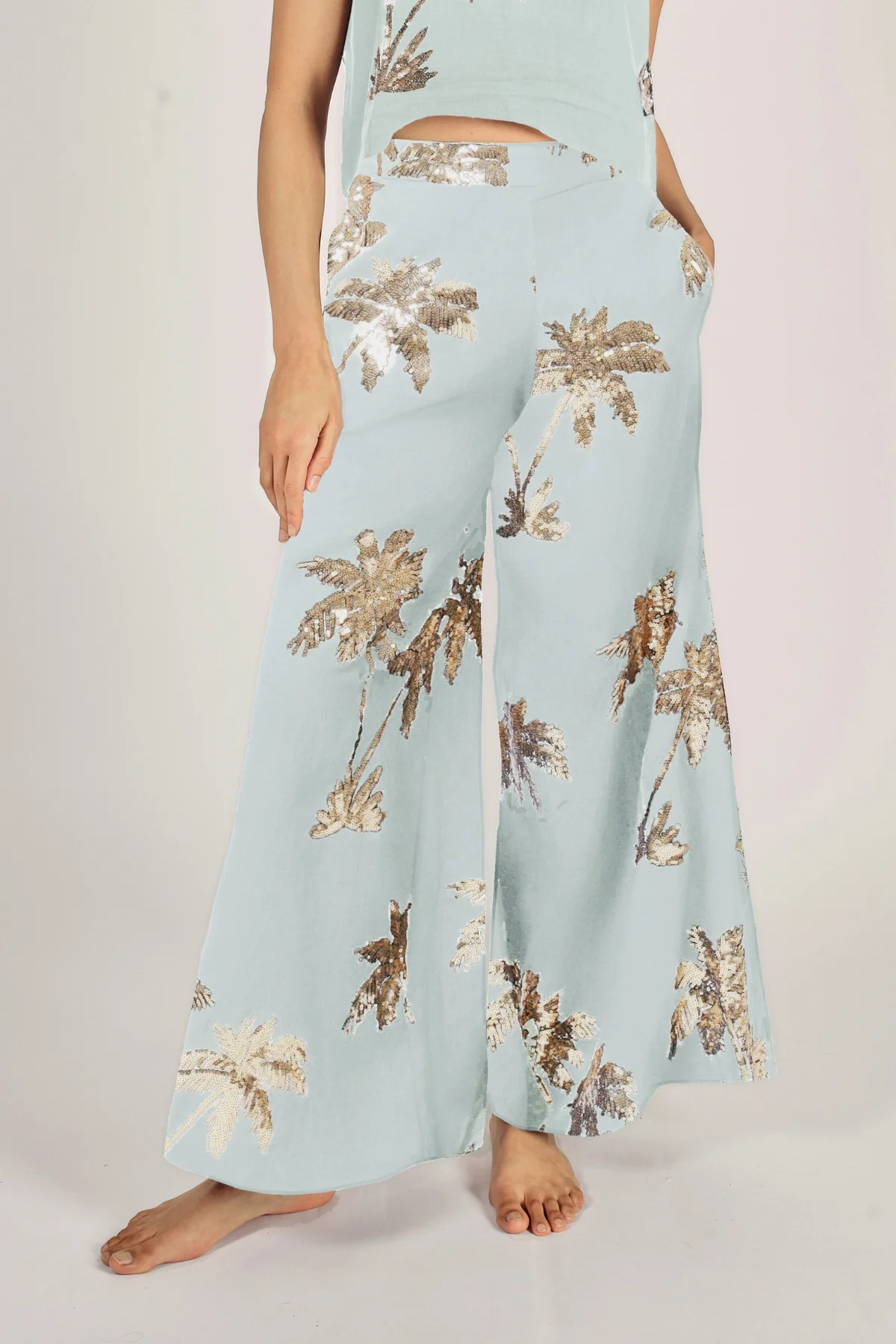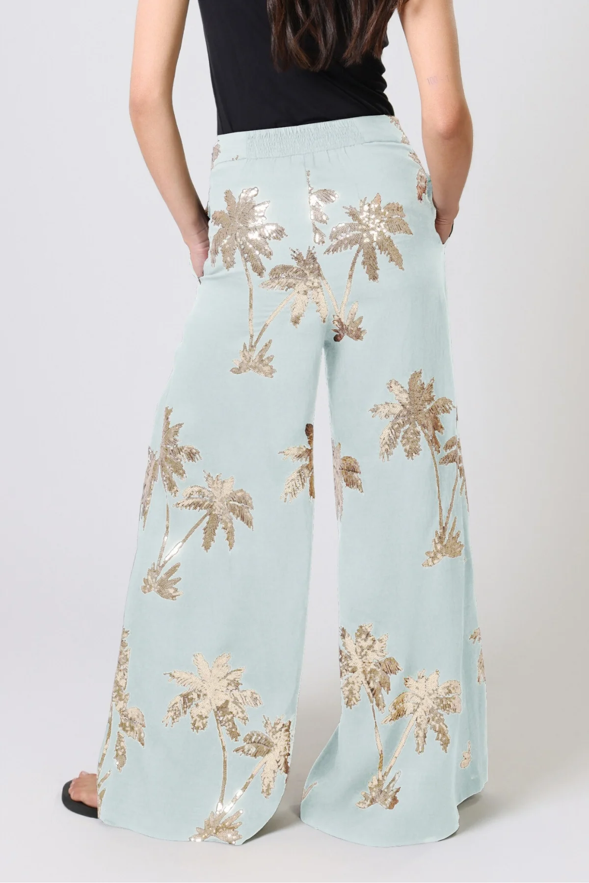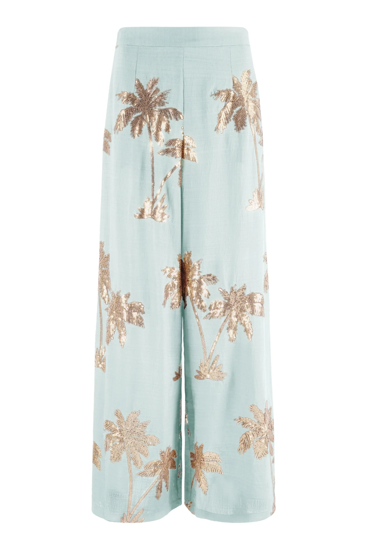 Our Rene women’s trousers have the most comfortable wide leg fit. Featuring a flat front mid-rise waistband with smocked elastic in the back to allow for a more comfortable fit. They have the essential side pockets and are finished with a side zip fastening. Add some sparkle to your summer wardrobe in this pale blue and gold palm tree sequined cotton. So easy to style to create a stunning party outfit.