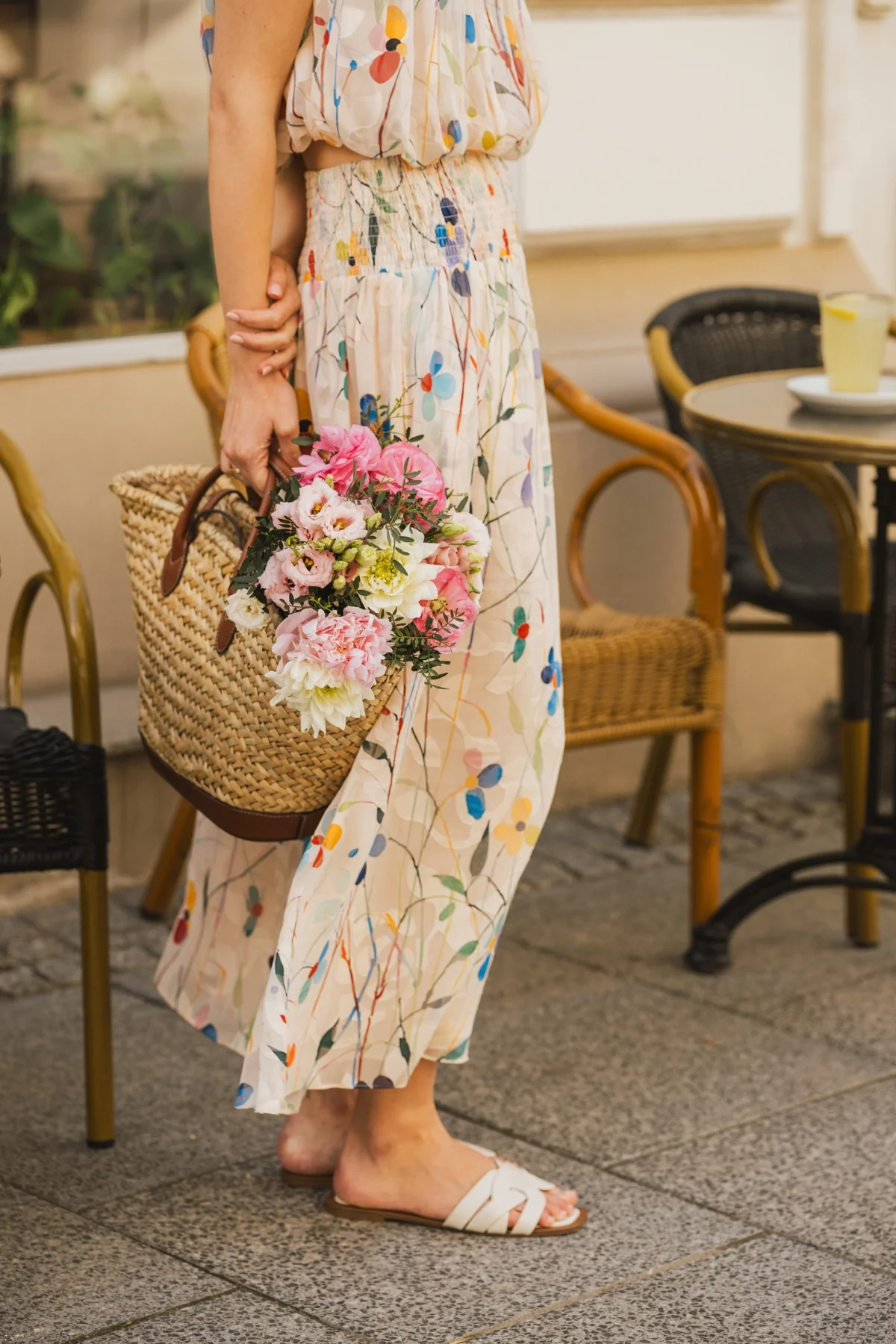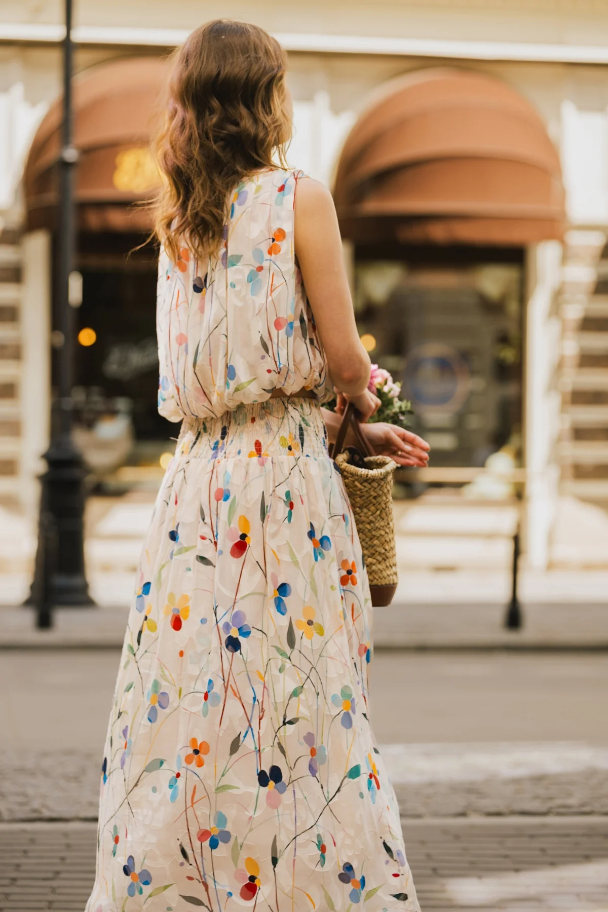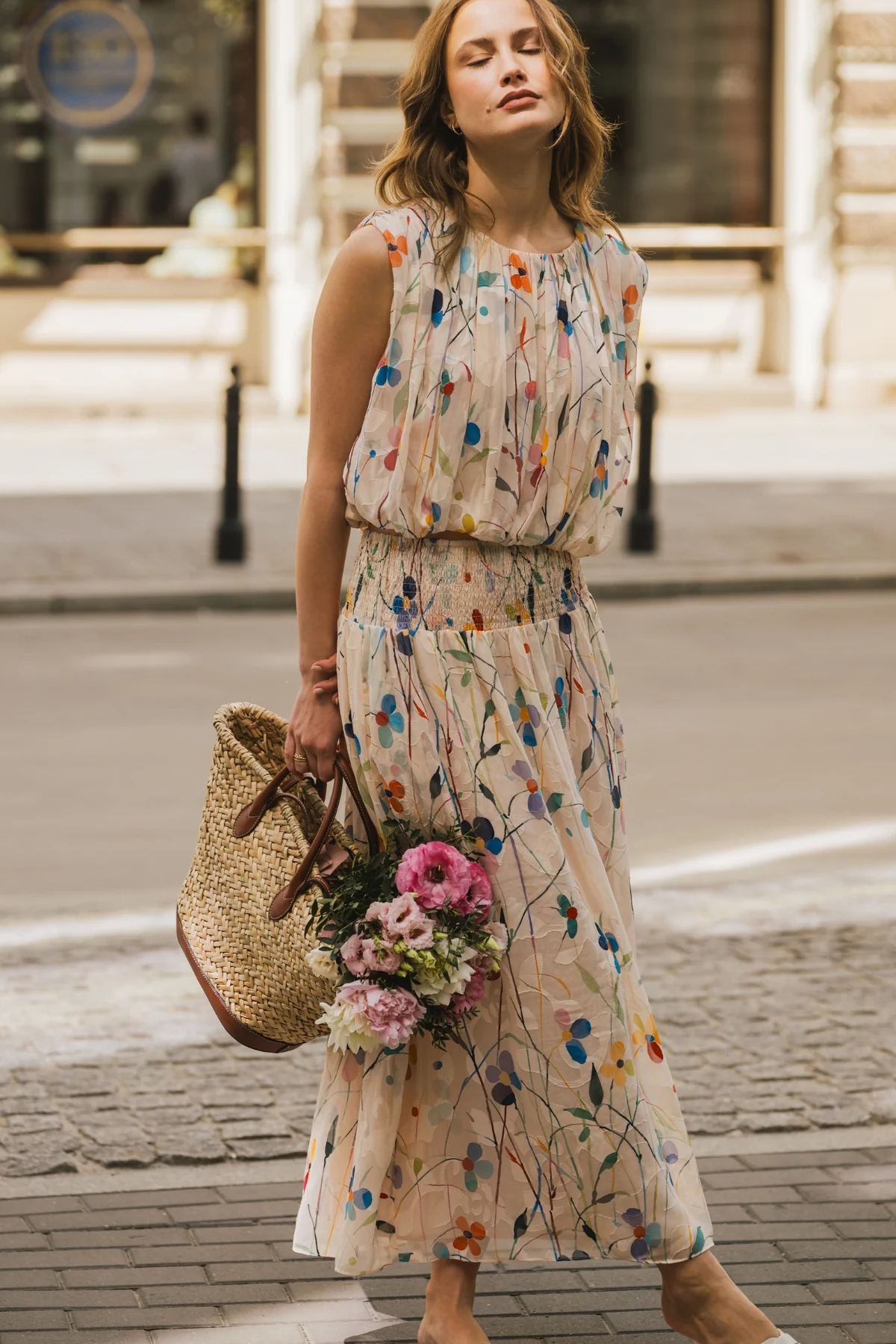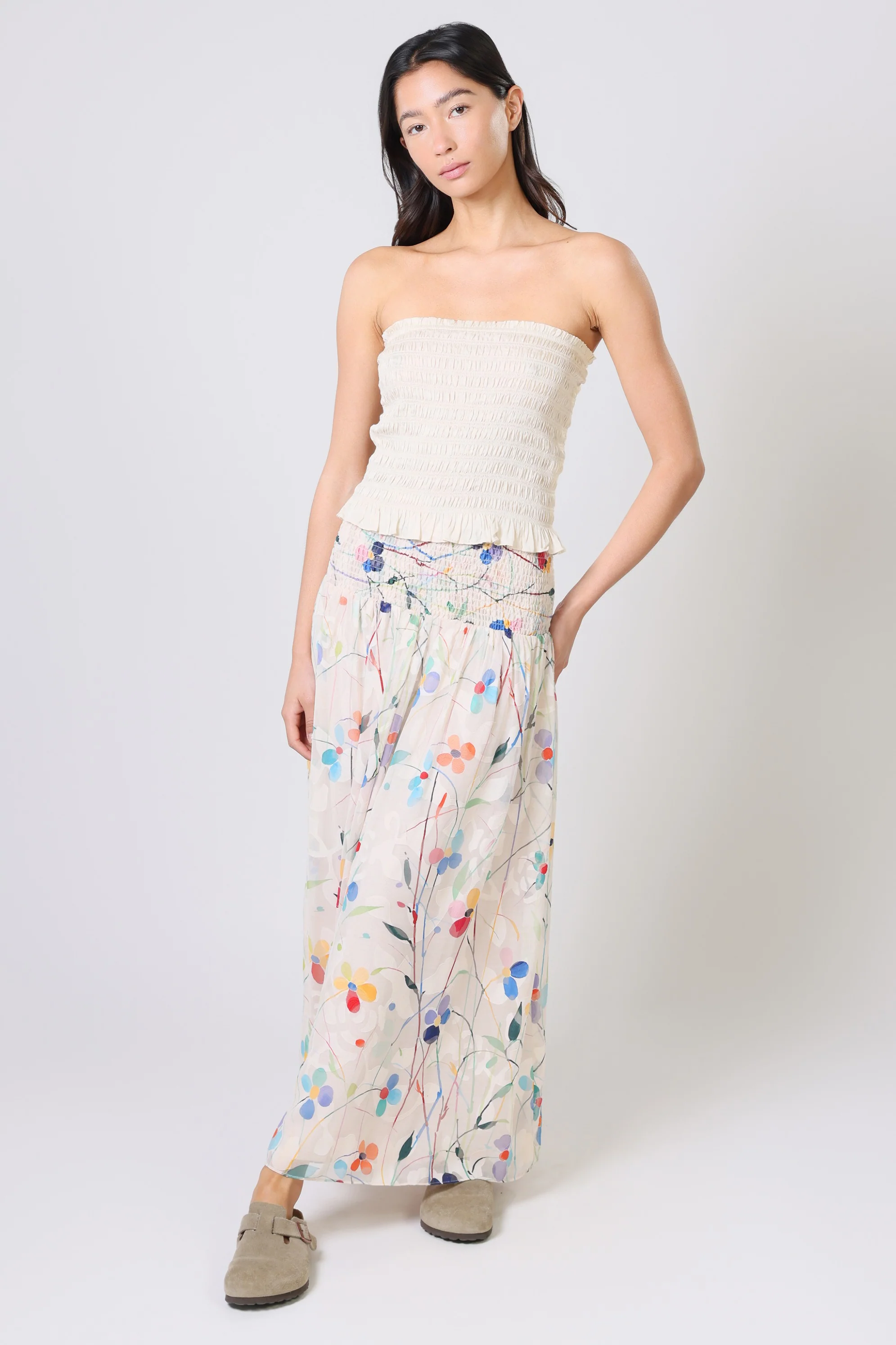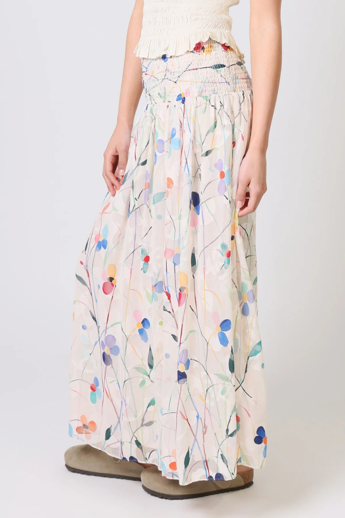 The Aurora Skirt has a classic A-Line shape, with an extra-wide elastic smocked waistband which is designed to allow for a low or high waist fit. Featuring side seam pockets. A stunning and versatile maxi skirt to add to your summer wardrobe. It has a beautiful white and multicolour floral print, bringing that perfect touch of Spring to any outfit.