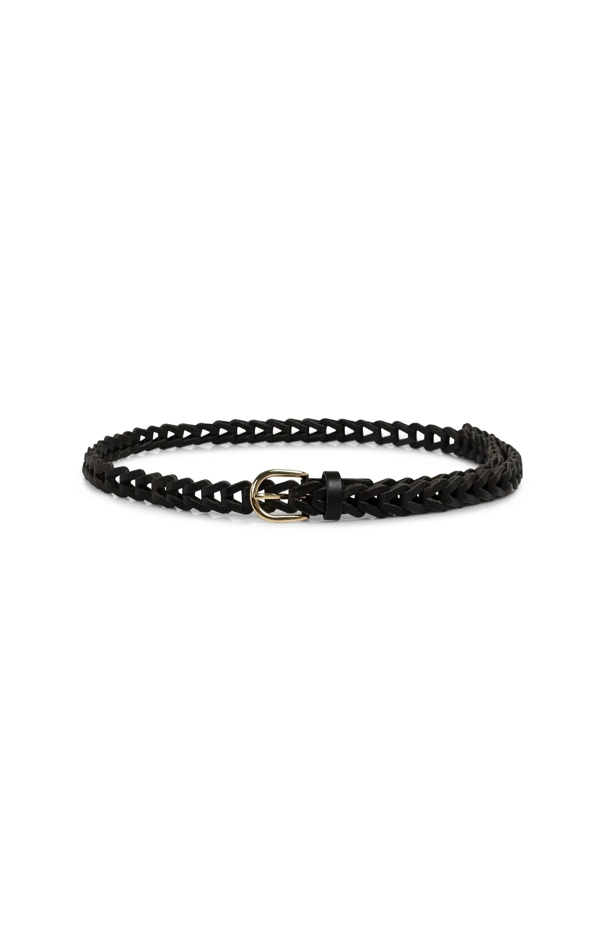 This stylish leather belt features a refined braided design and is finished with a subtle metal buckle. The slim shape gives the belt an elegant look, making it a versatile accessory. Perfect to wear with both trousers and dresses for a refined finishing touch.