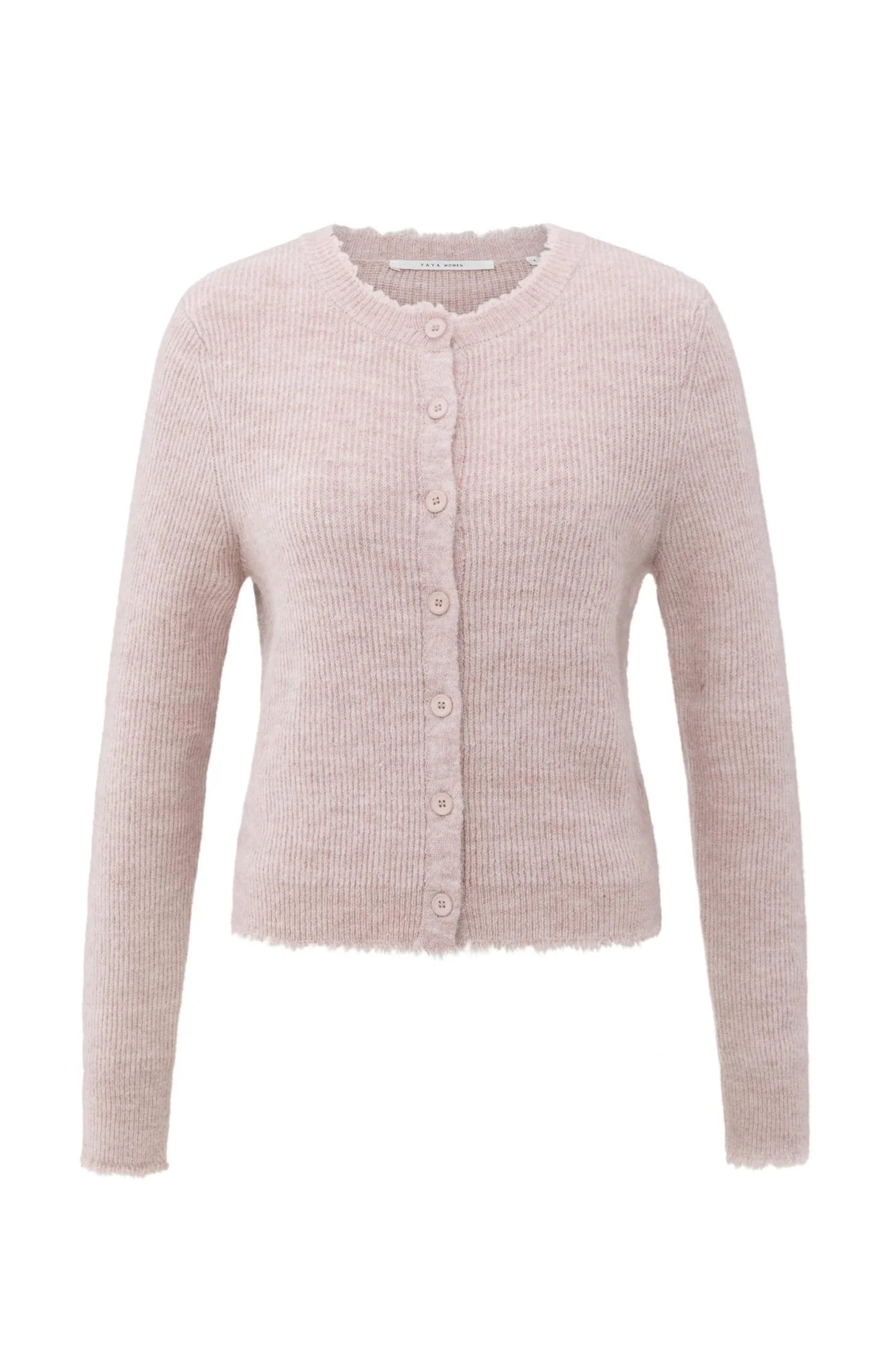 This short cardigan is crafted from a soft melange fabric and features a straight fit with long sleeves and a round neckline. The button closure and refined trim detailing at the collar, cuffs and hemline add a feminine and elegant touch. A versatile piece perfect for layering and everyday wear.