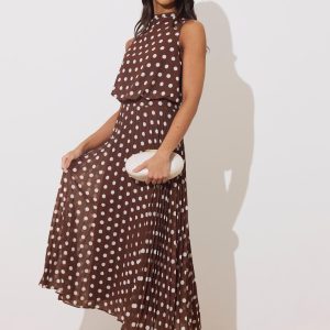 THE 8TH SIGN – Brown Polka Dot Milly Drape Pleat Skirt Midi Dress
