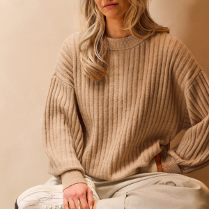 YAYA – Light Camel Ribbed Sweater With Round Neck And Long Sleeves